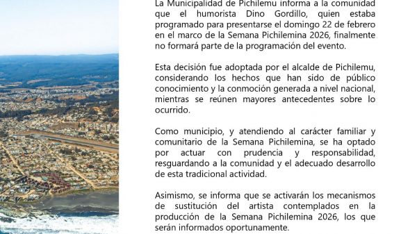 La Municipalidad de Pichilemu informa a la comunidad que el humorista Dino Gordillo, quien estaba programado para presentarse el domingo 22 de febrero en...