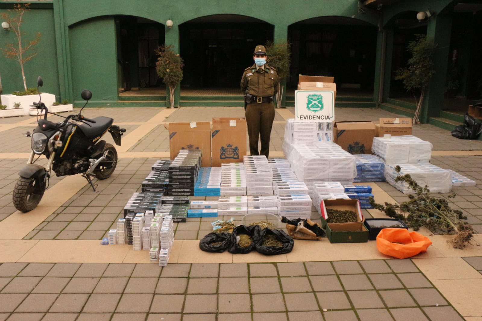 La fiscalización se realizó a un domicilio ubicado en la calle Bernardo O’Higgins, en el cual se encontraron escondidos cigarrillos de contrabando, 1.959 gramos de marihuana elaborada y una moto robada. El procedimiento finalizó en la detención de una persona y el decomiso total de la mercancía.