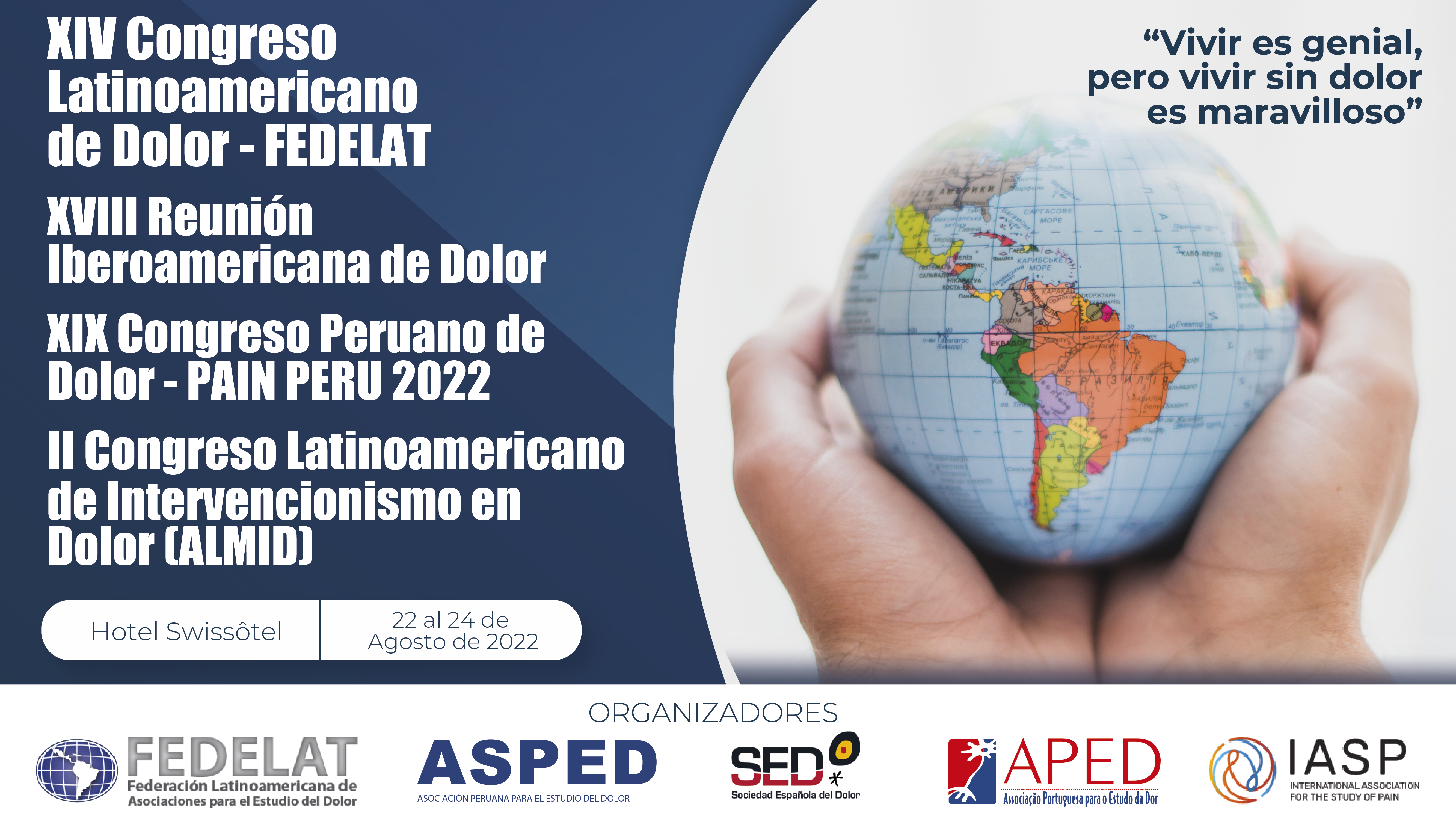 Para contribuir al intercambio de conocimientos sobre el dolor crónico, del 22 al 24 de agosto en Lima, Perú, se llevará a cabo el XIV Congreso Latinoamericano del Dolor, organizado por FEDELAT, la Asociación Peruana para el Estudio del Dolor (ASPED), la Sociedad Española de Dolor (SED) y la Asociación Portuguesa para el Estudio del Dolor (APED) y con la participación de la Asociación Internacional para el Estudio del Dolor (IASP).