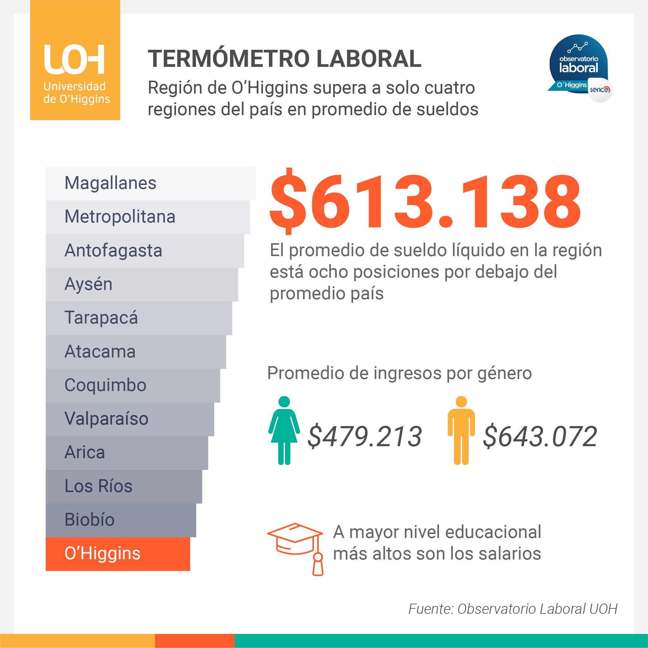 Las remuneraciones promedio de la Región de O’Higgins se encuentran entre las cinco más bajas del país, posicionándose doceava a nivel nacional, de acuerdo a lo que analizó el equipo del Observatorio Laboral del Sence de O’Higgins (OLO), en una edición especial del boletín Termómetro Laboral.