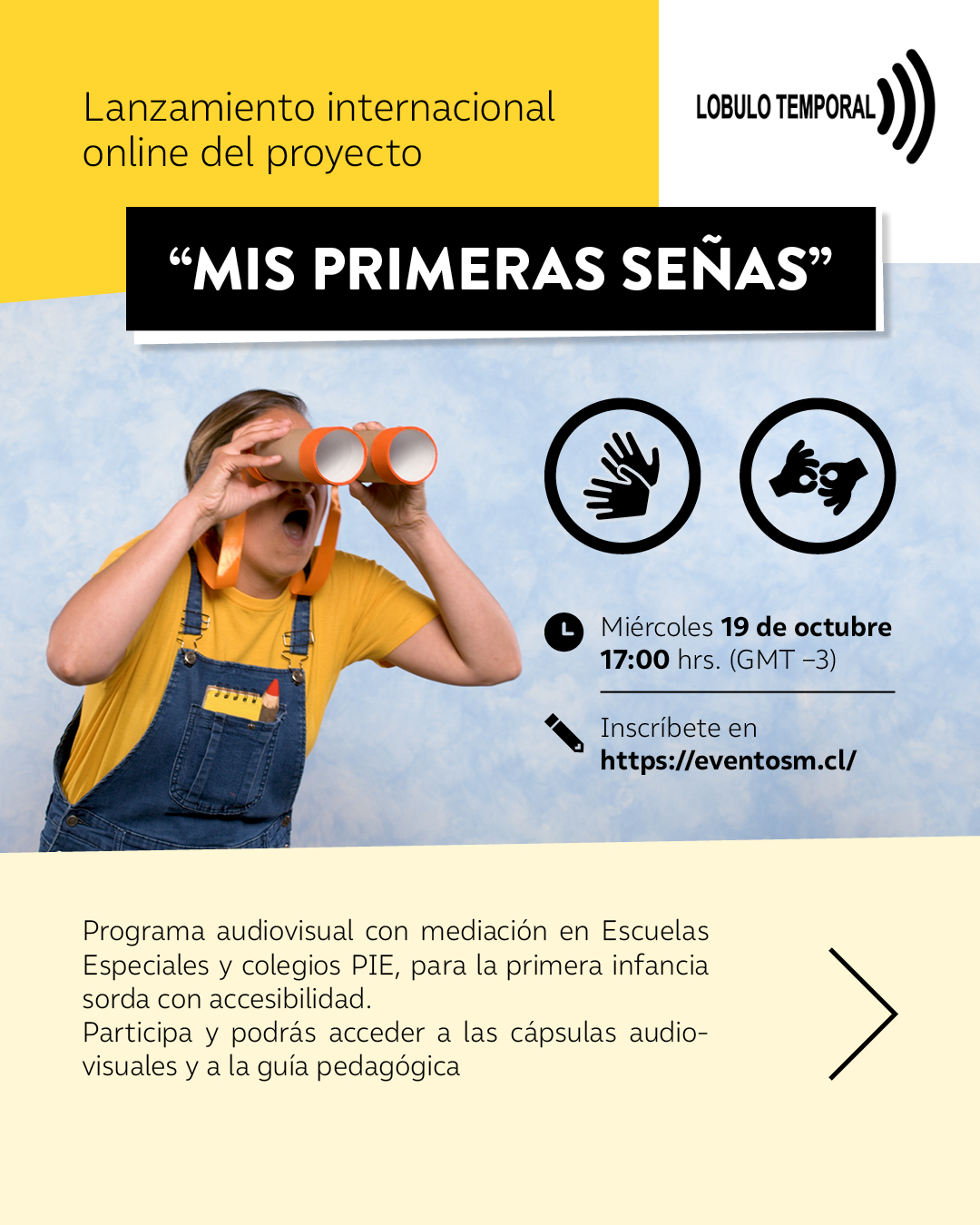 Se realizará un Webinar internacional sobre el proyecto “Mis primeras señas” de la Fundación Laboratorio de Arte Lóbulo Temporal. Programa piloto audiovisual con mediación en Escuelas especiales y colegios PIE para la primera Infancia Sorda con accesibilidad. Esta actividad será transmitida el miércoles 19 a las 17.00 hrs en la plataforma de YouTube de Fundación SM, donde se exhibirán y liberarán de forma gratuita y permanente las cápsulas audiovisuales realizadas bajo esta iniciativa, junto a su guía pedagógica.