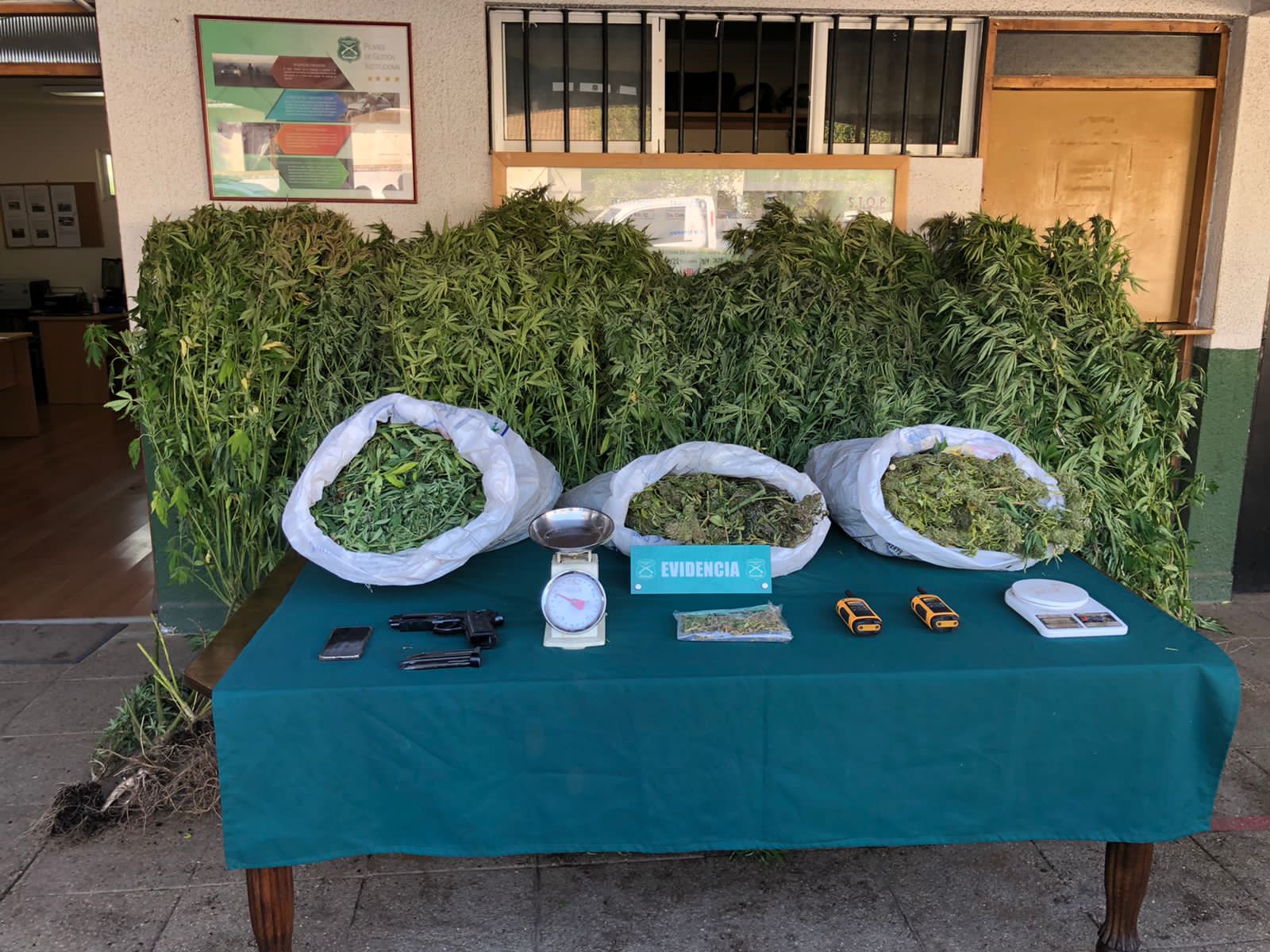 Este jueves, Carabineros del OS7, con la colaboración de la SIP de la 3ª comisaría Pichilemu, en Quebrada Honda de Litueche, luego de una investigación junto a Fiscalía, ingresaron, con una orden de entrada y registro, a una parcela, donde encontraron 13 kg. 785 grs. de marihuana elaborada; 72 plantas de Cannabis Sativa, de una altura de entre 10 cms. a 2 mts. Y otros elementos para comerte el delito de tráfico de drogas, como son dos pesas digitales, una pistola de aire comprimido, calibre 4,5 mm. con cargador, además de dos radios portátiles.