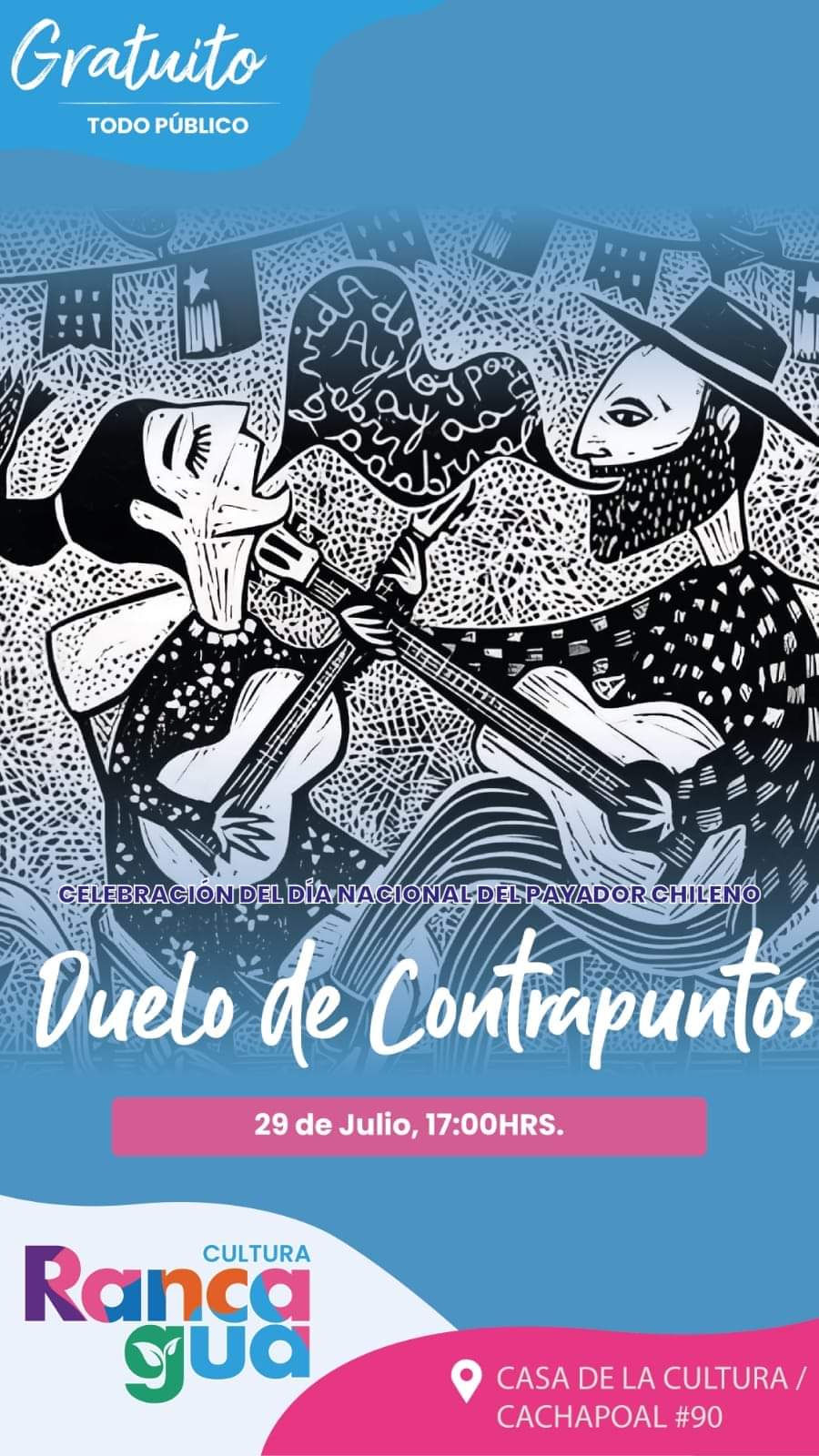 El programa culmina a las 17 horas en la Casa de la Cultura de Rancagua (avda. Cachapoal 90) con el Duelo Nacional de Contrapuntos, acto central de las celebraciones. Ahí los payadores y las payadoras se enfrentarán en diálogos poético-musicales, a través de la décima espinela.