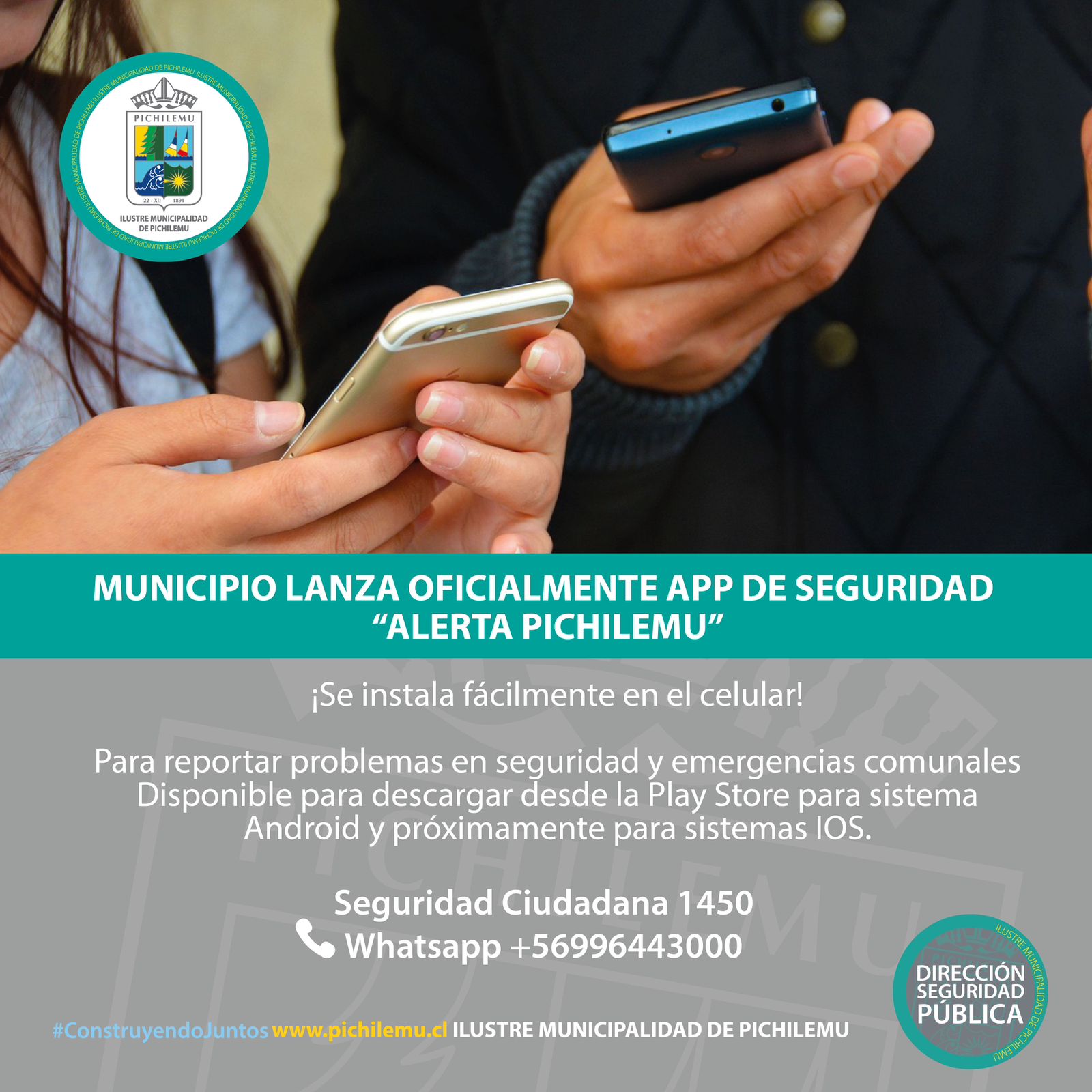 ALERTA PICHILEMU es una aplicación móvil diseñada por la Ilustre Municipalidad de Pichilemu, a través de la Dirección de Seguridad Pública, con el apoyo y financiamiento de la Subsecretaría de Prevención del Delito que permite reportar incidentes que se produzcan dentro de la comuna.