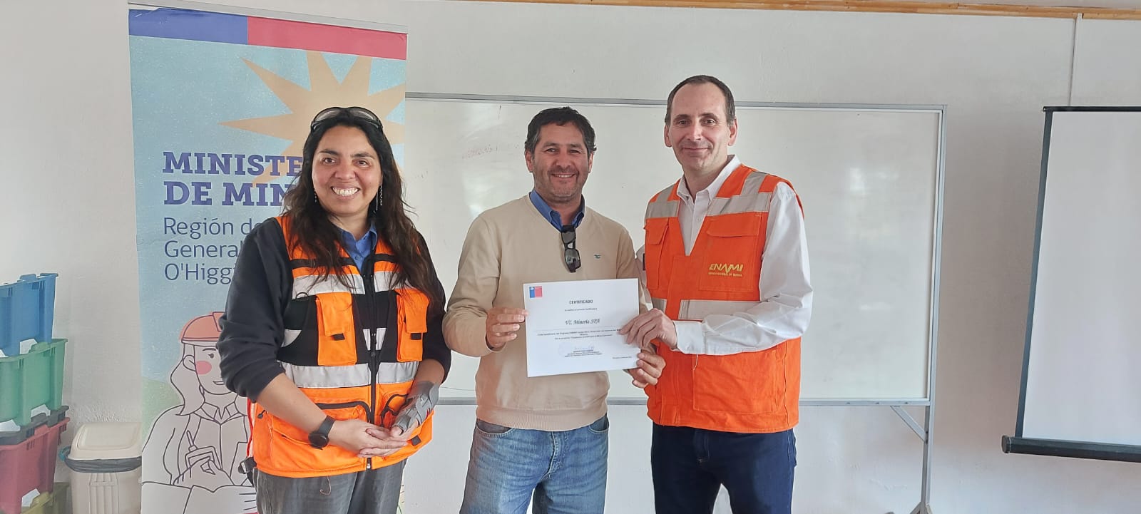 Los productores beneficiados por los fondos del Ministerio de Minería fueron convocados en la Escuela Mina Planta de Chancón para la entrega de certificados que acreditan la adjudicación de la maquinaria, en compañía del vicepresidente de Enami, Iván Mlynarz.