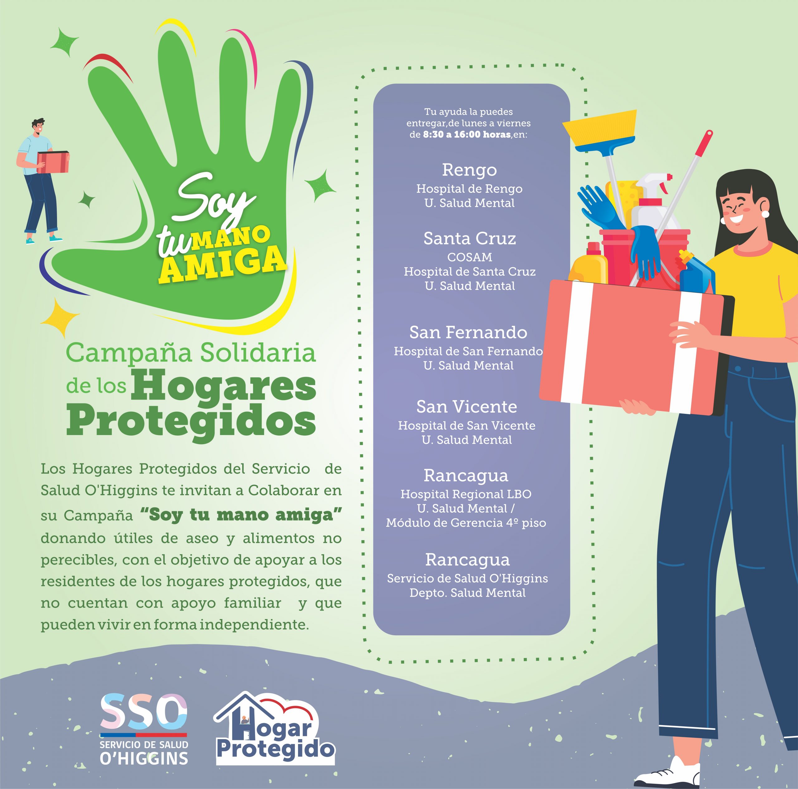 Durante todo el mes de diciembre se extenderá la campaña destinada a recabar útiles de aseo y alimentos no perecibles para apoyar a los usuarios de los 5 Hogares Protegidos que existen en la región O’Higgins, que acogen a personas con patologías psiquiátricas, que no tienen una red de apoyo, pero que son capaces de tener autonomía y vivir en forma independiente, con el acompañamiento del supervisor del hogar.