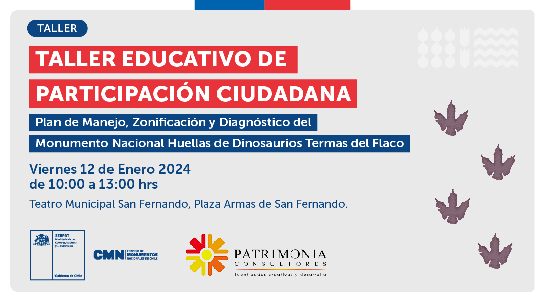 Con el objetivo de generar una instancia de divulgación de conocimiento científico y ciudadano, el Consejo de Monumentos Nacionales (CMN) y el Servicio Nacional del Patrimonio de la región de O’Higgins, están realizando una invitación abierta a toda la comunidad del valle de Colchagua, para asistir al Taller Educativo sobre Huellas del Dinosaurio, a realizarse el próximo viernes 12 de enero, a las 10 de la mañana, en el Centro Cultural de San Fernando.