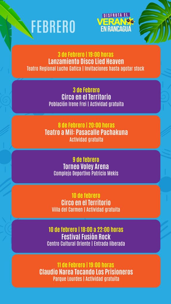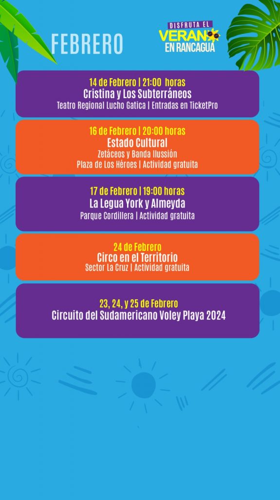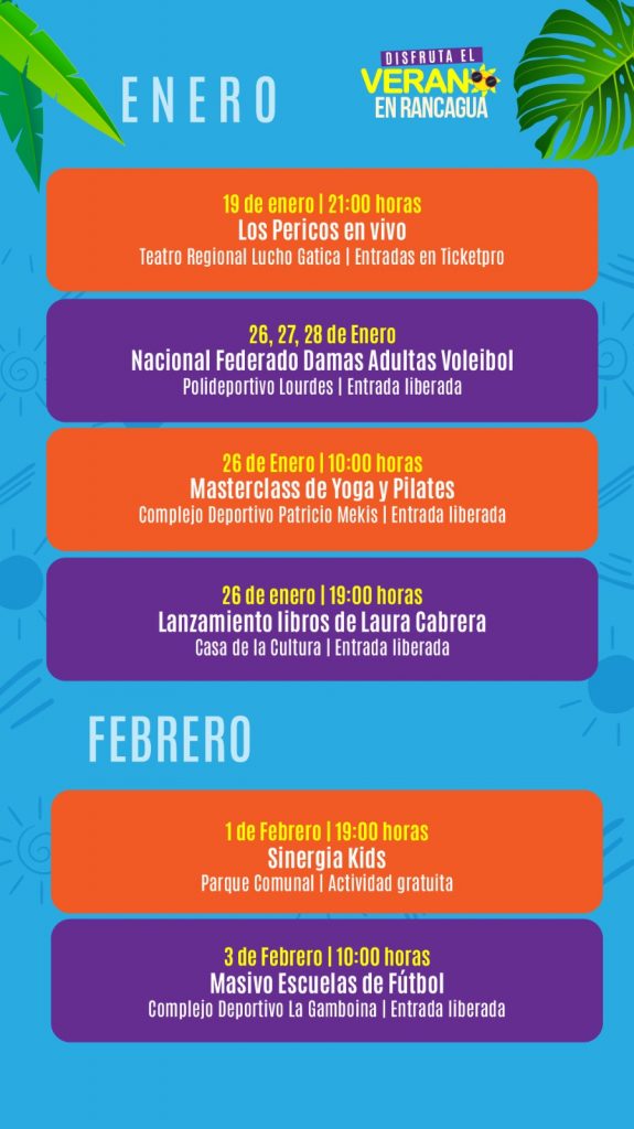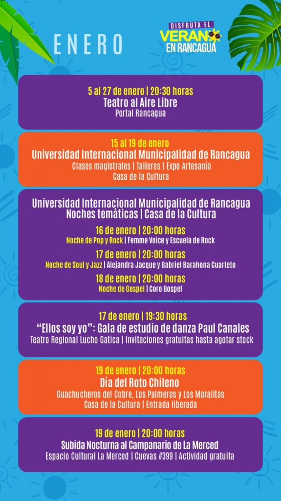 “Sin duda queremos que nuestras vecinas y vecinos disfruten de grandes actividades. Desde la Municipalidad de Rancagua queremos invitarlos a participar de esta entretenida cartelera -muchas de estas actividades totalmente gratuitas- y pensadas para toda la familia y para disfrutar con amigos y seres queridos en este verano en Rancagua”, enfatizó el alcalde Juan Ramón Godoy.