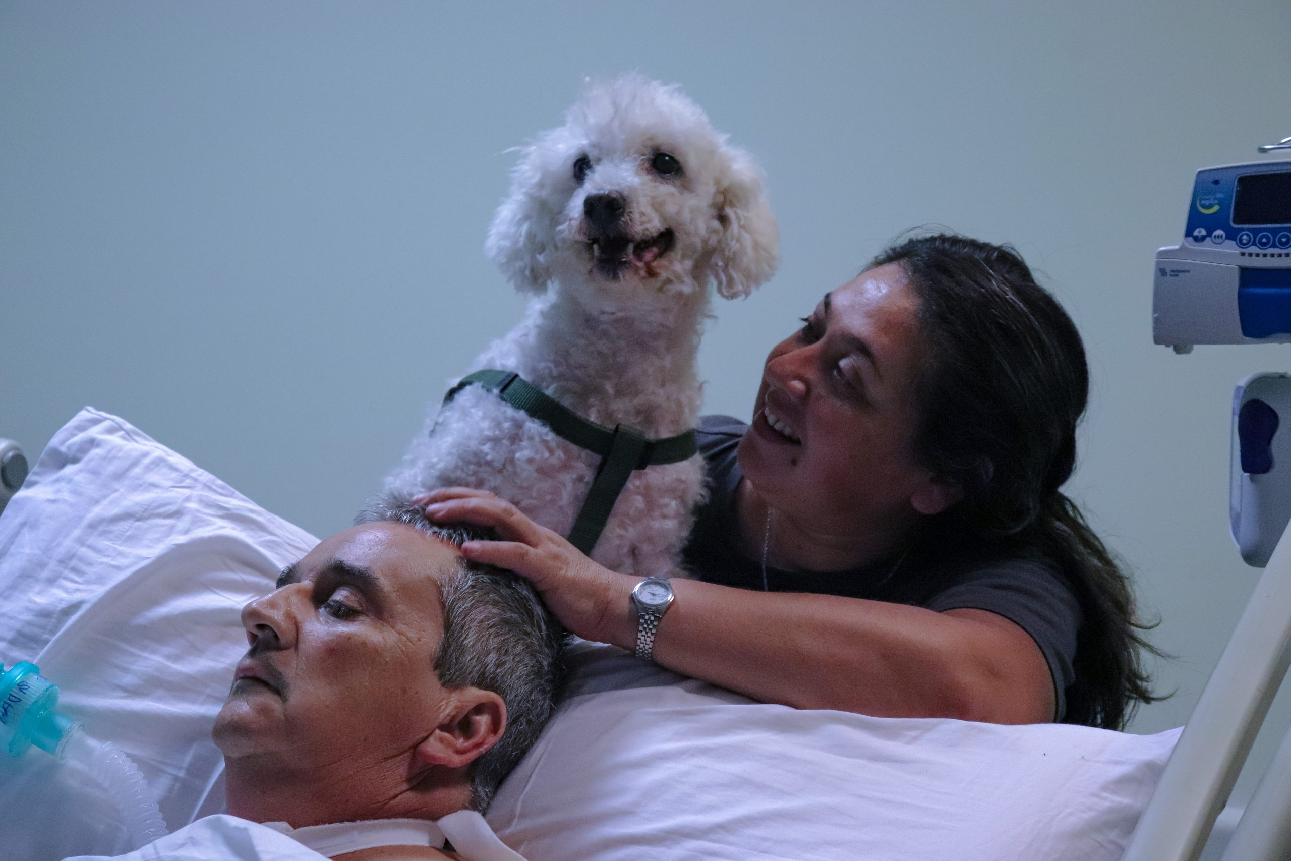 Johana Castro, dueña de la mascota visitante, expresó que “decidimos traer a Copito al hospital para que viera a Enrique, que ya sobrepasó el mes de hospitalización por complicaciones del síndrome de Guillain Barré que tiene, porque sabemos que ambos se extrañaban mucho, ya que el perrito es un hijo más en la familia que lo acompañaba en todo momento, pero, por sobre todo, porque sabemos que Copo puede favorecer su recuperación y motivarlo a que siga adelante para volver a la casa”.