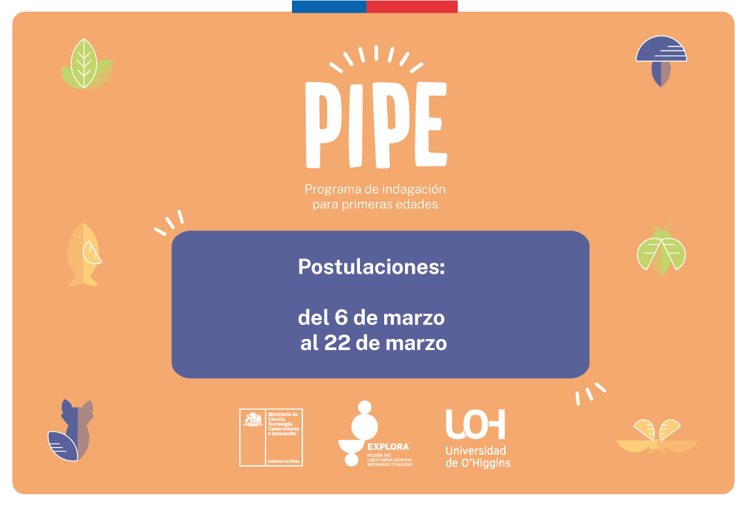 El Programa de Indagación para Primeras Edades (PIPE), es una iniciativa del programa Explora que busca fortalecer las competencias científicas de los equipos pedagógicos de Educación Parvularia y aportar al desarrollo de las competencias necesarias para que niñas y niños conozcan y comprendan su entorno desde la primera infancia. Como parte de esta iniciativa, se desarrollan módulos divididos en tres áreas de aprendizaje: Ciencias Naturales, Ciencias Sociales y Tecnología. PIPE 2024 para la Región de O´Higgins tendrá un cupo para 120 participantes (máximo dos por establecimiento).