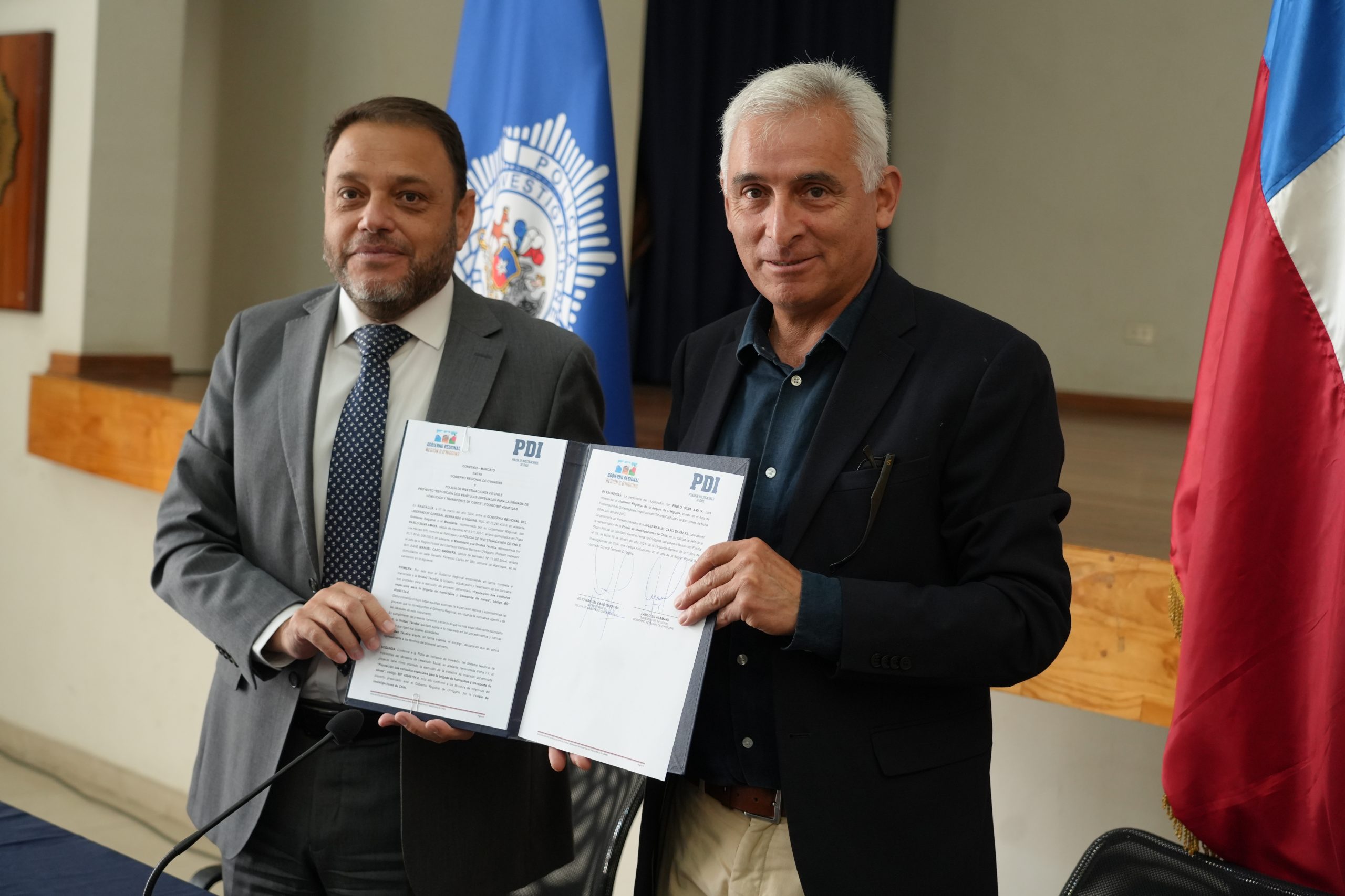 El Gobernador Regional Pablo Silva Amaya firmó este jueves un convenio con el jefe regional de la Policía de Investigaciones (PDI) en O´Higgins, prefecto inspector Julio Caro, para adquirir dos vehículos, uno para facilitar la labor que realiza en terreno la Brigada de Homicidios y otro para el transporte de canes de la Brigada Antinarcóticos.