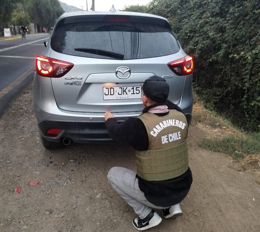 En otro procedimiento, también en Mostazal, pero en el sector del camino San Pedro, el SEBV recuperó un vehículo Station Wagon, marca Mazda, modelo CX-5, color plateado, que transitaba con la patente JDJK-15 falsa, según verificación de las series de motor y chasis. Al comprobar la verdadera identidad del vehículo, arrojó que éste registraba encargo policial vigente por el delito de Robo con intimidación, del 9 de marzo de 2024, en la comuna de Macul. Carabineros procedió a la detención de K.A.T.A, chileno, soltero, con antecedentes penal y policiales, por el delito de receptación de vehículo motorizado y uso malicioso de instrumento público, incautando el vehículo y 2 PPU falsas. Pasó a control de detención hoy en la mañana.