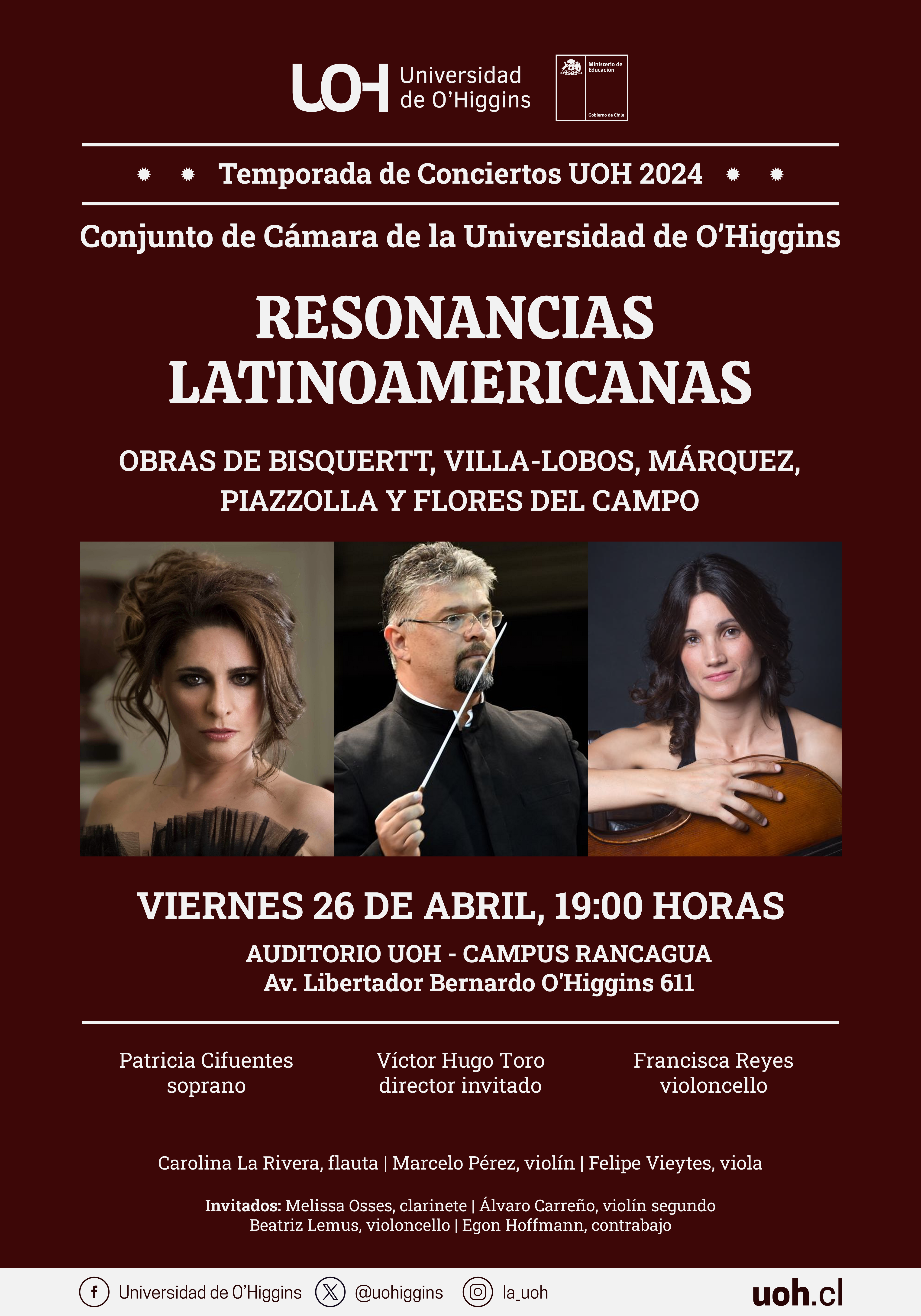 El Conjunto de Cámara de la Universidad de O´Higgins se complace en invitar a usted a la segunda fecha de la Temporada de Conciertos UOH 2024, con la presentación de un variado repertorio de obras de destacados compositores latinoamericanos, el próximo viernes 26 de abril a las 19:00 horas en el Auditorio del Campus Rancagua.