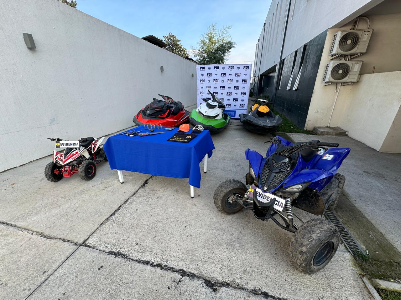 Tras allanar seis inmuebles, los policías detuvieron a los imputados, a quienes les incautaron especies que fueron sustraídas en los delitos cometidos, cuyo avalúo alcanza los 67 millones de pesos, correspondientes a dos cuatrimotos, tres motos de agua y un carro tipo food Truck.