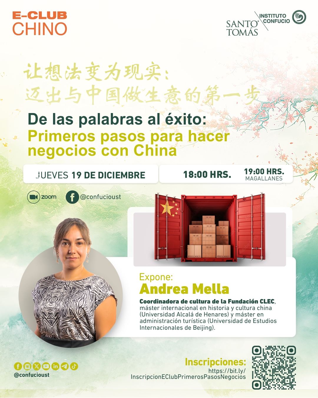 El E-Club Chino «De las palabras al éxito: Primeros pasos para hacer negocios con China» se realizará el jueves 19 de diciembre a las 18.00 horas a través de la plataforma Zoom y de un Live a través de Facebook. Las/los interesados en asistir a través de Zoom solo deben inscribirse previamente en el enlace https://bit.ly/InscripcionEClubPrimerosPasosNegocios, mientras quienes quieran verlo a través de Facebook sólo deben conectarse al Facebook @ConfucioUst a la hora indicada.