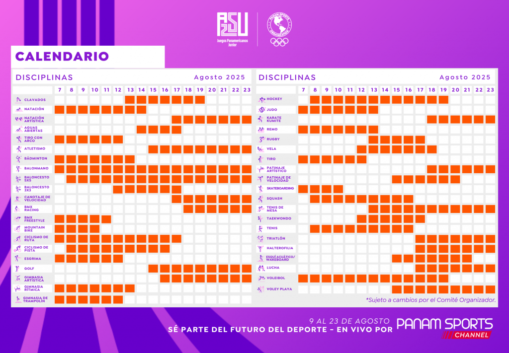 En total serán 28 deportes y 43 disciplinas las que habrá en el evento deportivo para juveniles más importante del mundo. Se espera la participación de 4206 atletas de los 41 países miembros de Panam Sports. Conoce aquí el detalle del Calendario Deportivo de ASU 2025.