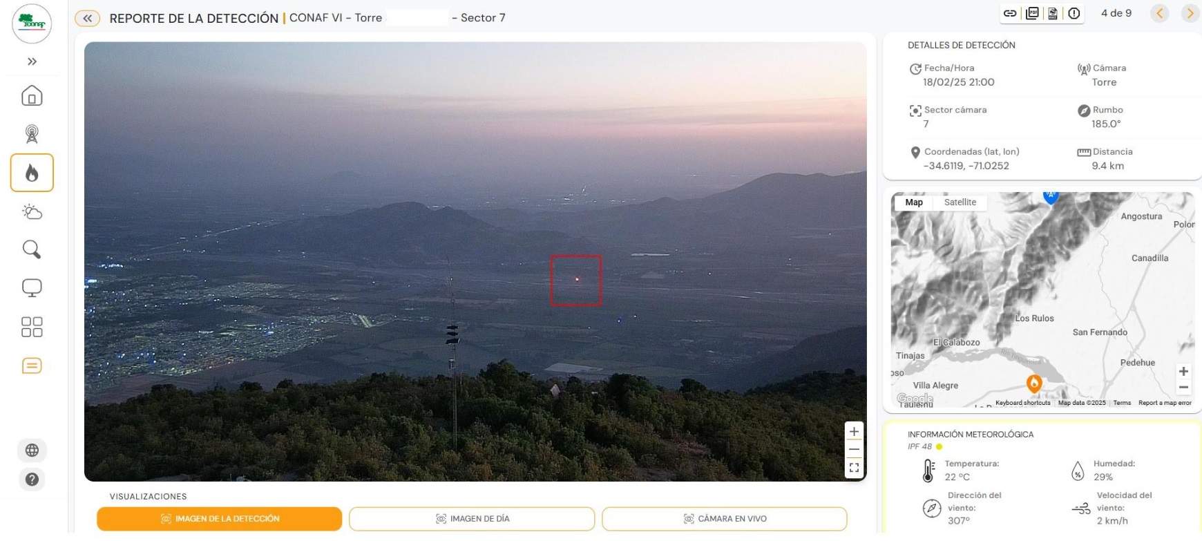 Por este motivo, la implementación de esta tecnología de punta es un gran aporte a los tiempos de respuesta y asignación de recursos para el combate, puesto que los focos de incendio son detectados mediante inteligencia artificial y un operador que valida estas detecciones y luego notifica inmediatamente a la central regional de CONAF. Este proceso detecta el foco de humo, envía una imagen y emite las coordenadas estimadas en menos de un minuto.