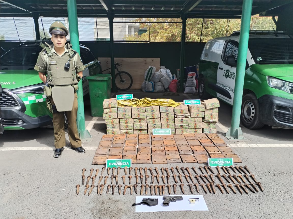 En el inmueble se encontraron diversas especies, entre ellas 40 sillas de apoyo de riel; 95 clavos de sujeción de riel pertenecientes a la empresa E.F.E., avaluados en 12 millones de pesos. Además, se decomisaron dos pistolas a fogueo y una munición calibre 22 sin percutir.