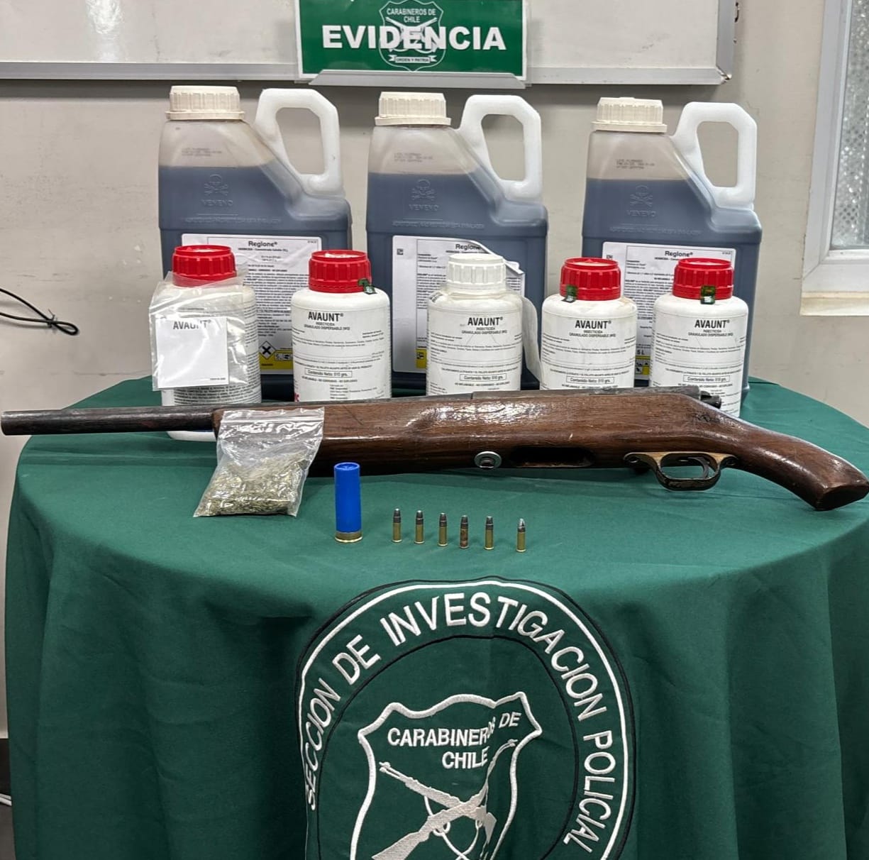 Asimismo, se incautaron diversas especies, entre ellas un armamento, tipo escopeta, marca Gamester, calibre 16; 1 Cartucho balístico, marca TEC, calibre 16; 6 cartuchos balísticos, sin marca, calibre .22; diversos químicos de uso agrícola; y 9 gramos de marihuana elaborada.