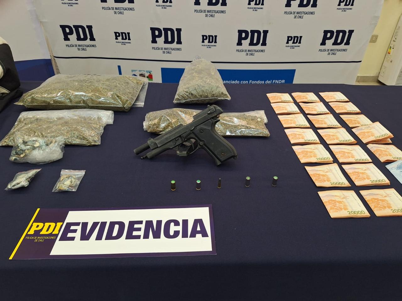 De acuerdo a lo señalado por la PDI, en el operativo realizado esta mañana, fue incautada una pistola, municiones y especies que habrían sido obtenidas en robos a viviendas, como carteras de marcas lujosas, chaquetas para motocicletas y alrededor de un millón ochocientos cuarenta mil pesos, en efectivo. De igual manera, fueron incautados 743 gramos de Cannabis y 19,8 gramos de hongos alucinógenos.