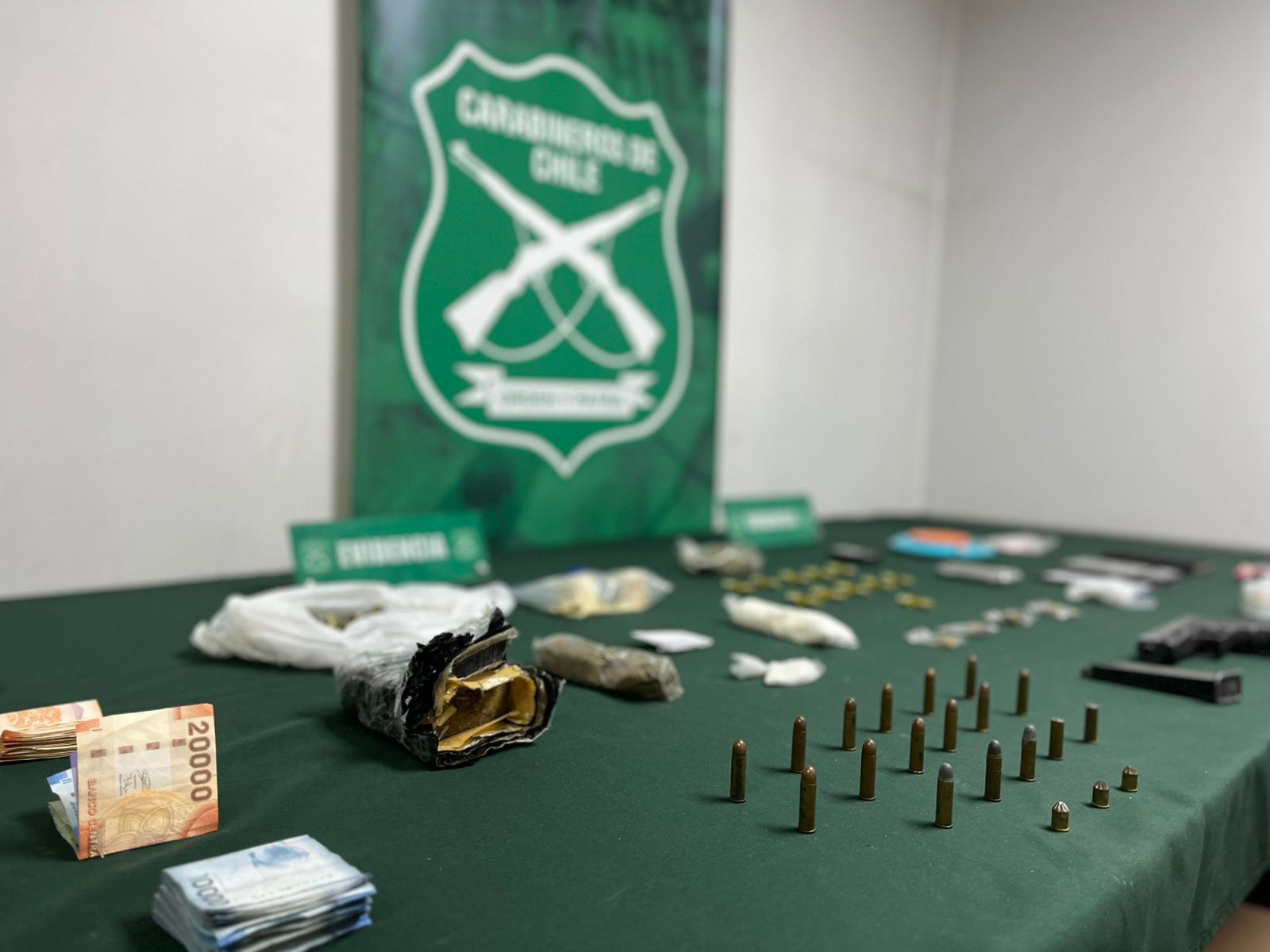 El operativo además permitió incautar una pistola, munición calibre .38 y cerca de 8,5 millones de pesos en efectivo, junto a otros elementos asociados al ilícito.