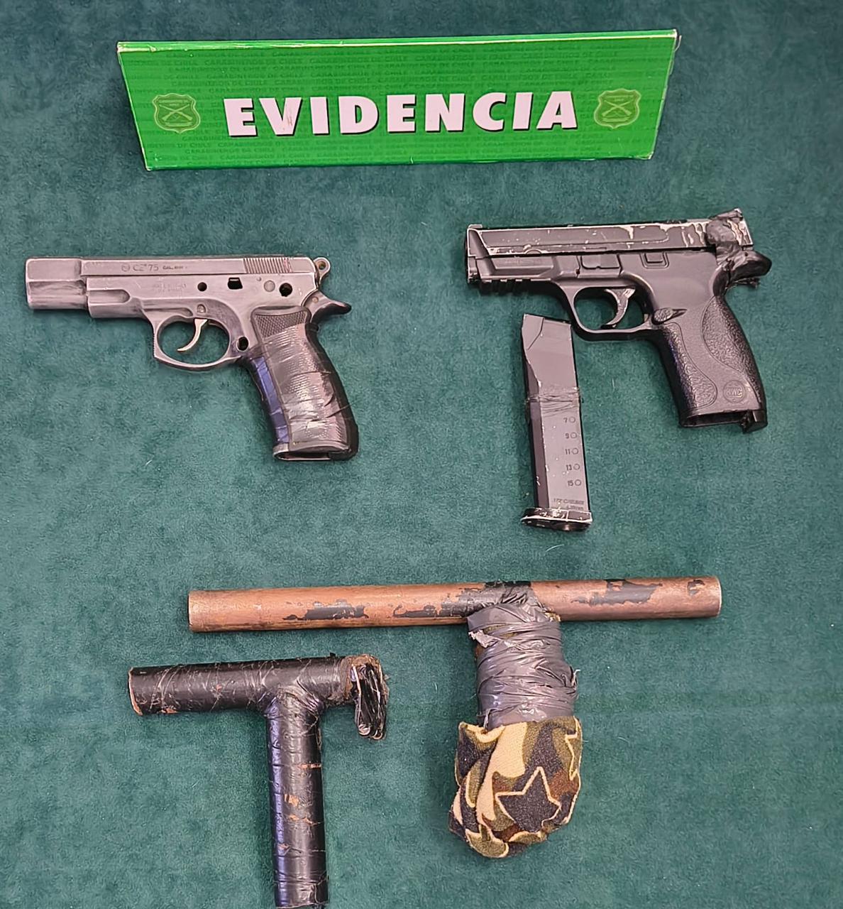 Ante la flagrancia, Carabineros ingresó al domicilio, logrando la detención e incautación de armas de fuego, consistente en 2 pistolas sin munición adaptadas para el disparo y 1 escopeta de fabricación artesanal. Frente a estos hechos fue detenido el sujeto y una mujer dueña del inmueble, por el porte ilegal de armas. El individuo, identificado como M.A.C.B., además mantenía una orden de aprehensión vigente con fecha 10.12.2024 por el delito de receptación de vehículo, del Tribunal Oral en lo Penal de Rancagua.