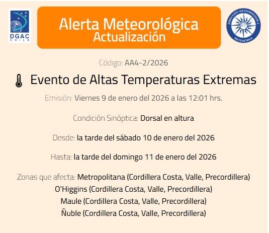 La Dirección Meteorológica de Chile (DMC) ha emitido una Alerta Meteorológica (Código AA4-2/2026) debido a un evento de altas temperaturas extremas que afectará a la zona centro-sur del país durante los días sábado 10 y domingo 11 de enero de 2026.