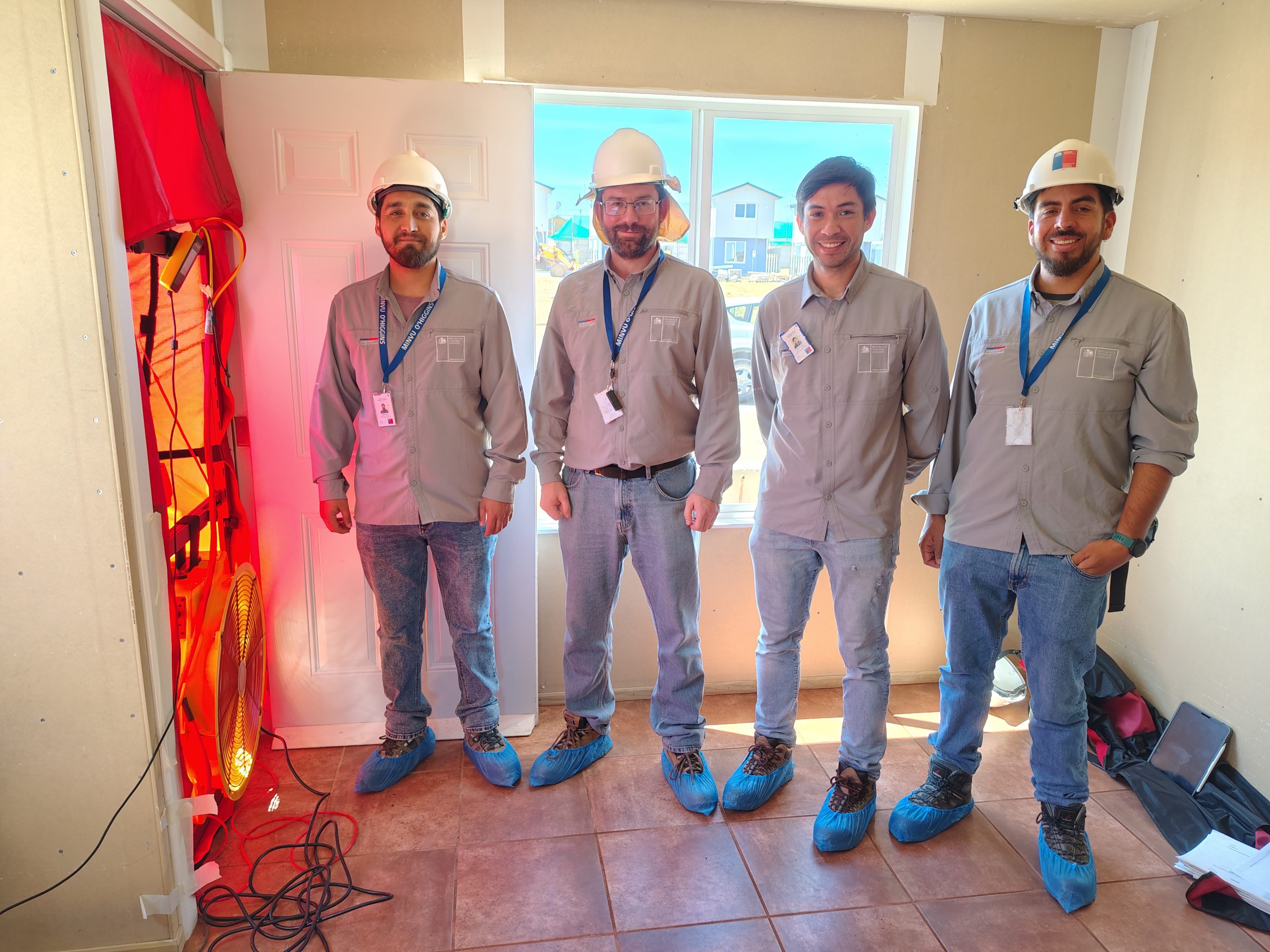 La jornada fue impartida por Andrés Romero y Carlos Olivares, profesionales de Minvu Los Lagos reconocidos por su experiencia en inspección de proyectos mediante este instrumental. En ese contexto, Cristóbal Silva, Ariel Ramírez, Eduardo Rojas y Gustavo Carreño adquirieron conocimientos técnicos para utilizar correctamente el equipo Blower Door, sistema que permite medir la hermeticidad al aire de una vivienda, detectando filtraciones no controladas que inciden directamente en el desempeño térmico y el consumo energético.